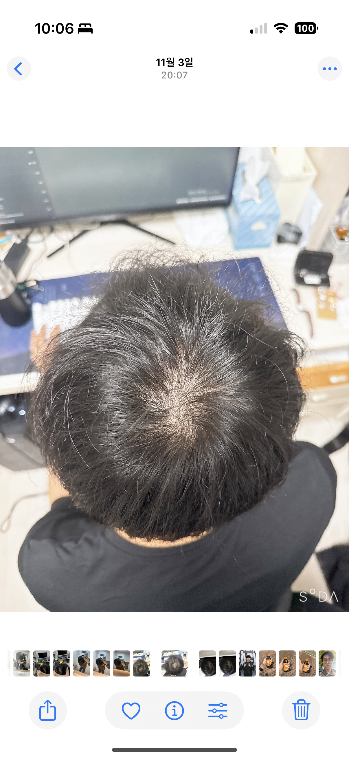 안녕하세요. 8월 27일에 수술하고 벌써 두 달이 지났네요. 시간 참 빠릅니다. 수술 직후엔 하루하루가 느리게 가더니, 이제는 출근하고 일하다 보면 어느새 주말이고, 머리도 조금씩 변하고 있어서 신기합니다. 2주차 때까지만 해도 붓기도 살짝 남아있고, 간지러움 때문에 괜히 예민했는데 지금은 그런 건 전혀 없습니다. 세안할 때나 머리 감을 때도 불편함 전혀 없고, 일상생활에 지장은 1도 없어요. 요즘은 암흑기가 온건지 머리가 빠지는 것도 조금씩 보입니다. 처음엔 조금 당황했는데 병원에서 이미 들었던 부분이라 그냥 담담히 받아들이고 있어요. 사진으로 보면 전보다 휑해진 느낌이 있긴 하지만, 가까이서 보면 짧고 가는 새 머리들이 촘촘하게 올라오고 있습니다. 수술 부위 쪽은 만졌을 때 살짝 까슬까슬한 느낌이 있고, 짧은 솜털 같은 것도 조금씩 올라오고 있어요. 눈으로 보면 아직 티는 안 나지만, 가까이서 보면 ‘뭔가 자라고 있긴 하구나’ 싶습니다ㅎㅎ 정수리 쪽은 아직 살짝 듬성듬성해 보이지만, 각도나 조명 따라 보면 짧은 솜털들이 반짝거려서 희망적입니다!! 모자는 여전히 매일 쓰고 다니고 있고, 회사에서도 아무도 모릅니다. 비절개 삭발 방식으로 하길 정말 잘한 것 같아요. 지금 길이도 짧아서 깔끔하고, 머리 감거나 말리기도 편하네요. 약은 꾸준히 복용 중이고, 병원 관리도 정기적으로 받고 있습니다. 한달에 한번씩 병원가서 진정 관리해주니까 확실히 가려움이나 건조함이 덜해졌어요. 원장님이 말씀하신 것처럼, 이 시기엔 조급해하지 말고 두피 청결 유지랑 생활습관 관리에 집중하려고 합니다. 아직은 결과를 논하기엔 이르지만, 경과는 나쁘지 않은 것 같습니다. 앞으로 3~4개월차쯤 되면 눈에 띄는 변화가 있을 거라 기대하면서 꾸준히 관리 중입니다. 다음 후기 때는 좀 더 풍성해진 모습으로 찾아뵙겠습니다!