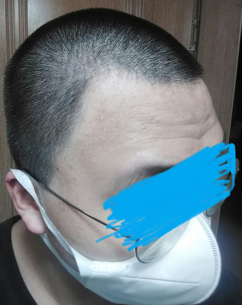 20岁出头,为了矫正M型脱发、降低额头高度,决定植发,第一次到医院就诊时,医生护士都很有信心地讲解,马上手术。 之后第2周摘除了结痂,与其他医院不同,被告知可以开始喝酒和吸烟,从第1个月开始移植头发开始脱落,目前几乎没有头发。