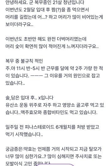 术后1个月增加简要后期。 拆线2周后去医院做角质护理(?) 据说是20万韩元的服务,但只要喷洒药品、洗头、晒10分钟红外线(如果让我交钱,就绝对要收...) 拍了几张照片,拿了脱发药处方就下来了。 请9个月后再来。 一个月左右,黑暗期似乎开始了。 使用指纹洗发水后,无论是原有毛发还是移植毛发,都会掉很多。 洗发水时切开/移植部位还有点疼痛。