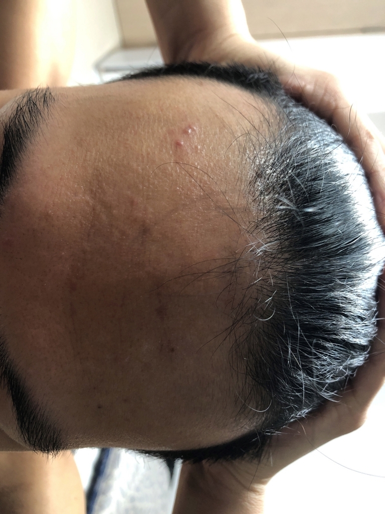 20岁出头,为了矫正M型脱发、降低额头高度,决定植发,第一次到医院就诊时,医生护士都很有信心地讲解,马上手术。 之后第2周摘除了结痂,与其他医院不同,被告知可以开始喝酒和吸烟,从第1个月开始移植头发开始脱落,目前几乎没有头发。