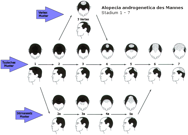 脱发症的形态有额头、正头、颞等多种多样,大部分属于汉密尔顿-诺伍德(Hamilton-Norwood)脱发症形态分类中的一个,罕见的情况下,脱发在全境分散发生或从头顶到头发变少的女性型脱发症。