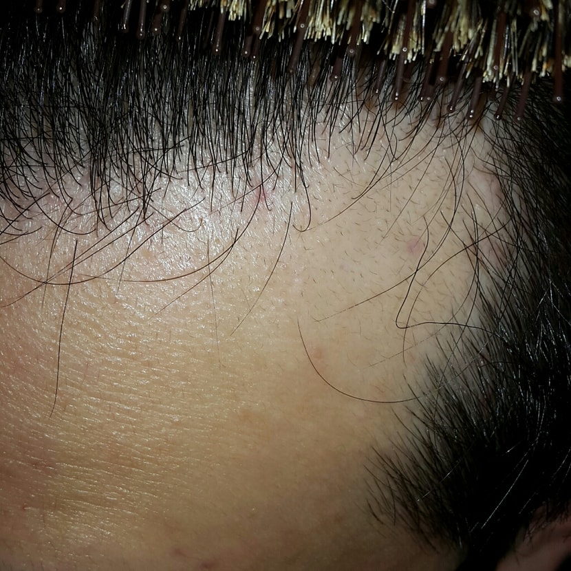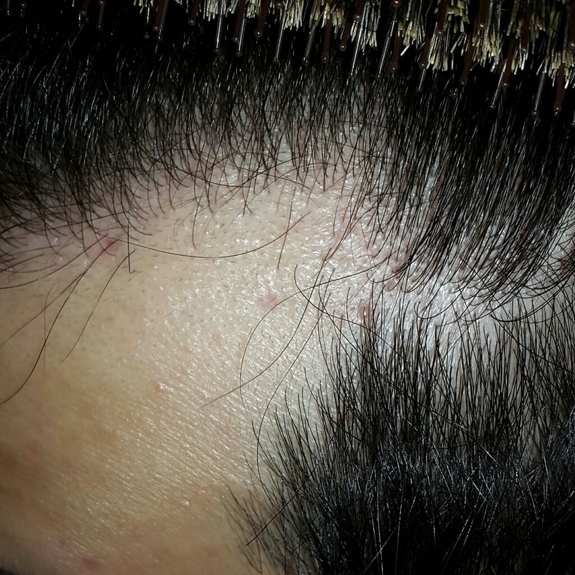 20岁出头,为了矫正M型脱发、降低额头高度,决定植发,第一次到医院就诊时,医生护士都很有信心地讲解,马上手术。 之后第2周摘除了结痂,与其他医院不同,被告知可以开始喝酒和吸烟,从第1个月开始移植头发开始脱落,目前几乎没有头发。