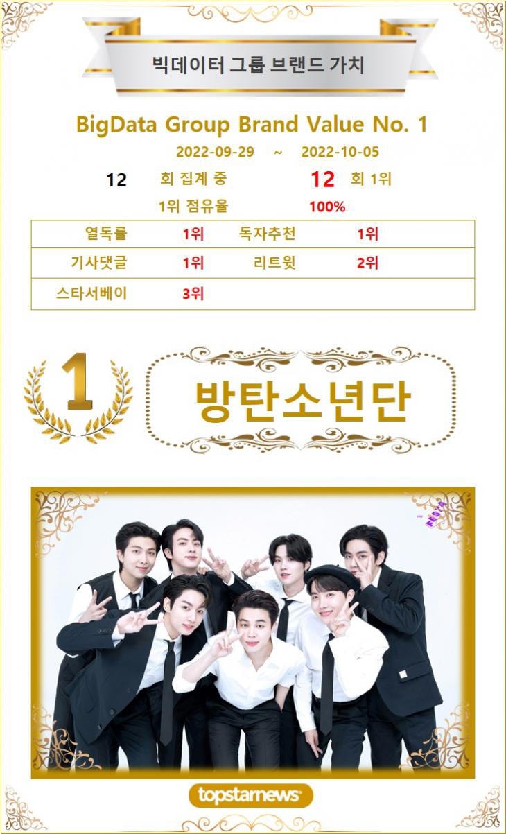 빅데이터 그룹 브랜드 종합 순위 1위는 방탄소년단