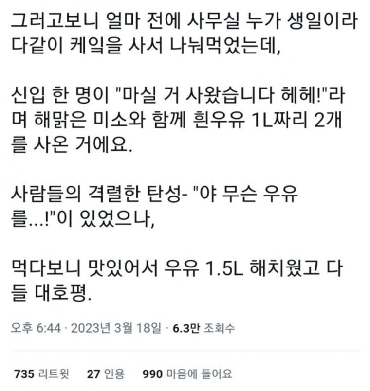 [幽默&热点] 신입이 흰우유 1L짜리 2개를 사왔다