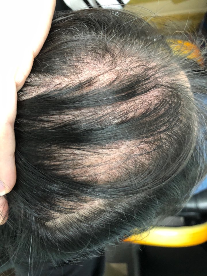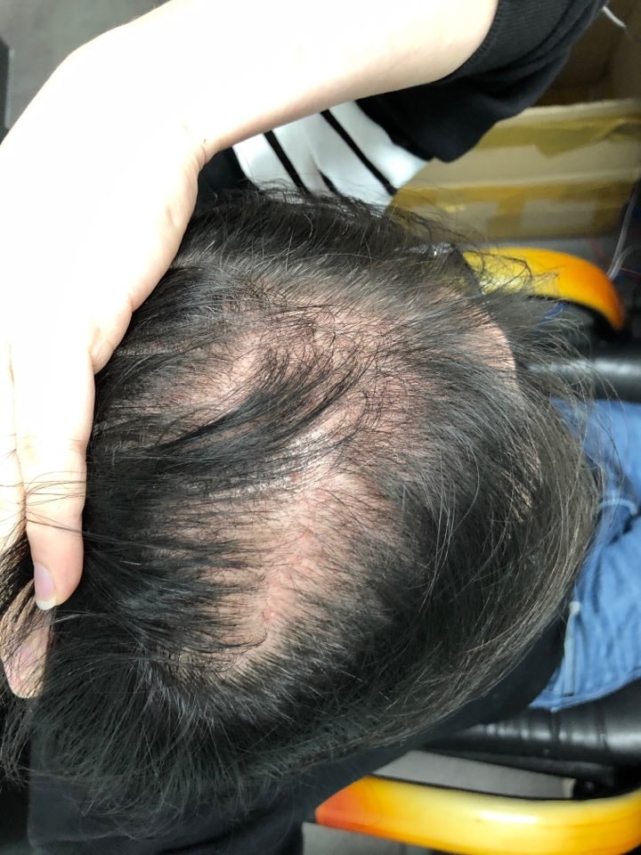 20岁出头,为了矫正M型脱发、降低额头高度,决定植发,第一次到医院就诊时,医生护士都很有信心地讲解,马上手术。 之后第2周摘除了结痂,与其他医院不同,被告知可以开始喝酒和吸烟,从第1个月开始移植头发开始脱落,目前几乎没有头发。