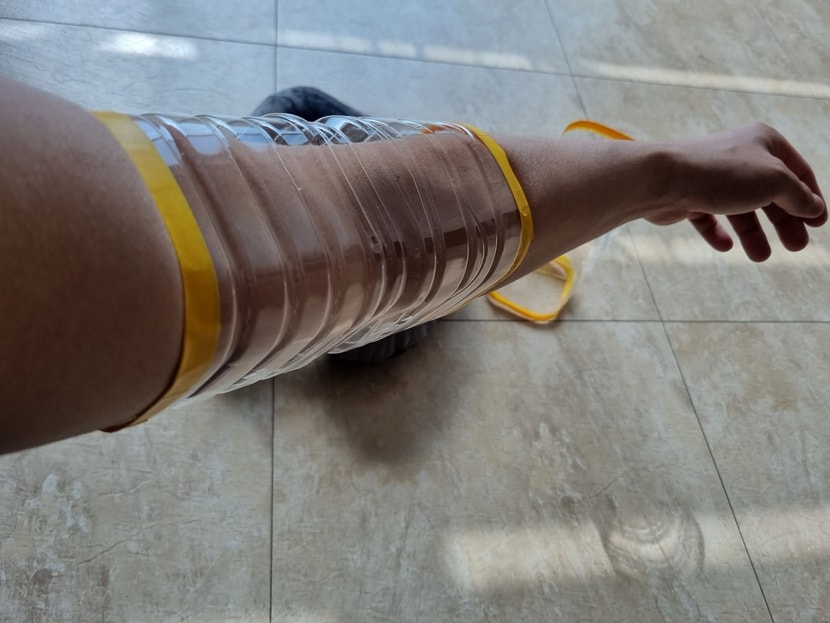 移植手术后担心在睡眠中无意中挠头皮而准备<据我所知,也有人会用绳索、细绳、领带绑住手睡觉,我个人觉得会很不方便,所以准备了矿泉水瓶>