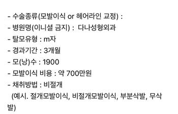 因为脱发一点一点进行,所以决定马上进行毛发移植。 我下定决心在符合挑选医院标准的Hannaeve plastic surgery医院进行手术。 医生亲自做一切的信任感和认知度,几乎不会留下任何后记和手术痕迹。 有非切开微创手术似乎是决定医院的最大理由。 手术中完全没有疼痛,医生和医护人员都很舒服,所以顺利完成了手术。 但手术后10日内不能使用洗发水/护发产品,以及需要戒酒/戒烟等。 像我的话,因为上述原因,安心地使用一周的休假进行了手术。 手术后没过多久,病程还需要进一步观察。 - 医院名:狎鸥亭某+The Ham医院 - 脱发类型:M字脱发+额头前密度不足 - 毛(囊)数:3500毛 - 毛发移植价格:900后半段 - 采集方法:非切开式微保湿面膜 - 移植方法:植毛机,医生直接移植