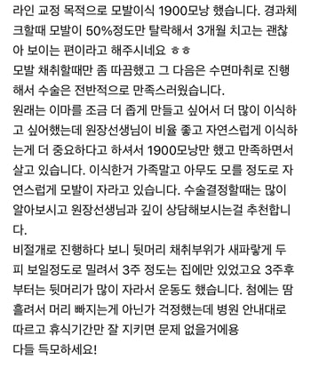 不久前去医院做了经过报告 院长说这种程度的话 毛发还算快 还没有长好 随着时间的流逝密度会变好的. 刚开始担心黑暗期 但是时间就是正确答案. 坚持的话一定会过去的. 回想半年前的样子,我觉得手术做得很好。. 毛发移植手术是和花费的时间和费用成正比的手术. 但是需要长时间了解选择医院的过程,还要进行多处咨询。. 说实话 需要准备一定的预算才能实现. 我的朋友是 10大概是几年前在廉价宣传的地方接受了手术, 两边移植是不同的护士做的 所以头发方向不一样. 虽然最近几乎没有 但是听到这句话的时候受到了很大的冲击.. 从那时候开始我就想 移植必须得是医生亲自执刀的医院. 特别是毛发移植是反复几千次体臭和种植的疲劳度很高的手术。.. 多娜整形外科说医生之间会诊,所以更加信任他。. 还有满意的部分是从手术前到手术后的管理都给予照顾。. 不只是做好手术就能结束 7可以免费洗发水,也可以免费住院一天。. 1这几年一直都有免费Retouch的保证,如果没有自信就无法保证,所以实力非常强,室长也细心地介绍了恢复期间需要注意的地方,所以不用担心。 从结果来看 修图效果很好 不用烦恼. 俞重浩院长说每个人的毛囊个数都是固定的 不是增加的概念, 毛发移植说:"因为是转移丰富部位毛囊的手术,所以不要贪心。 1400先移植毛囊 然后如果需要的话再修容. 如果想成是别人的事情的话, 不用一次种很多, 在医院立场上会更方便, 但是站在患者的立场上真心地判断了。. 托大家的福 后面的头发也维持得很好 没有明显的差异. 因为发际线这段时间压力很大,现在站稳了脚跟,舒服多了。. 能感觉到他在为患者着想, 现在看结果也觉得选得很好.