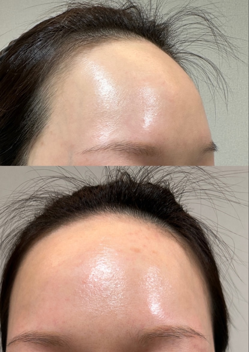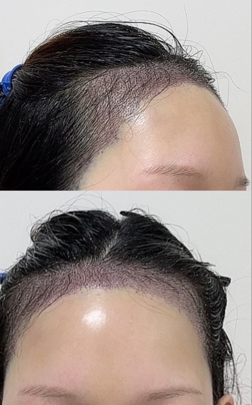 额头植发坦率后记 (自然清淡的版本) 最近每次照镜子的时候最在意的部分就是"额头线条"。 特别是戴上发带,M字型显得更加突出,每次拍照时自信心都会下降。 所以最终下了很大的决心,接受了额头毛发移植。 1. 术前 从照片中可以看出,从正面看额头很宽,M字型稍微空着。 平时即使看不出来,但撩头发或运动的时候,感觉头发看起来不多,所以压力很大。 2. 设计阶段 像第二张照片一样,和医生充分商谈, 以自然的女性线条为目标抓住了曲线。 画得太圆的话 会有点尴尬 我喜欢两边柔和填满的方式设计。 3. 手术后立即&恢复 移植后虽然有些浮肿和结痂 疼痛没有想象中那么严重 只要遵守洗发水的方法,并不难。 刚开始很担心'这个能站稳脚跟吗?' 随着时间的流逝,神奇地像自己的头发一样站稳了脚跟。 4. 移植后 第三张照片是现在的样子。 额头线条确实变得柔和自然, 看起来宽敞的感觉减少了很多。 • 没有刘海撩头发也很自然 • 发带 运动发型 拍照的时候自信心一下子上升了 • 整体脸型更柔软了 最重要的是"陌生人看到后完全不知道的程度"是最令人满意的。 5. 总评 如果是因额头线条感到压力的人,手术确实很有帮助。 我个人非常满意 "为什么不早点做呢?"