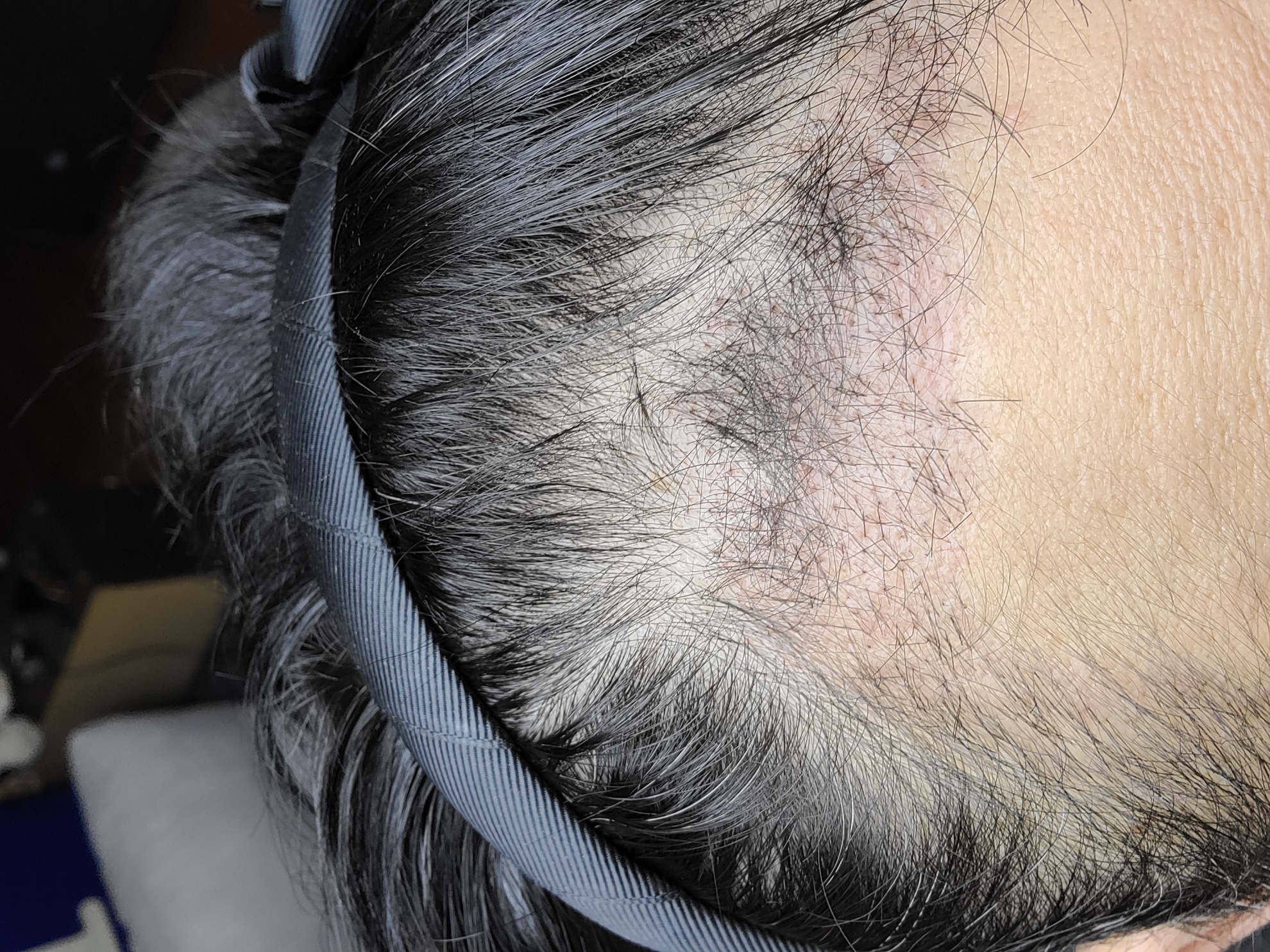 20岁出头,为了矫正M型脱发、降低额头高度,决定植发,第一次到医院就诊时,医生护士都很有信心地讲解,马上手术。 之后第2周摘除了结痂,与其他医院不同,被告知可以开始喝酒和吸烟,从第1个月开始移植头发开始脱落,目前几乎没有头发。