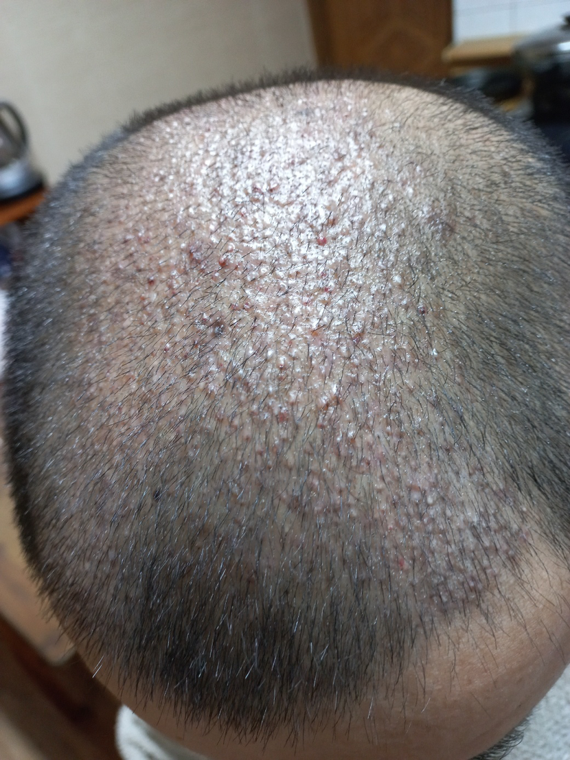 20岁出头,为了矫正M型脱发、降低额头高度,决定植发,第一次到医院就诊时,医生护士都很有信心地讲解,马上手术。 之后第2周摘除了结痂,与其他医院不同,被告知可以开始喝酒和吸烟,从第1个月开始移植头发开始脱落,目前几乎没有头发。