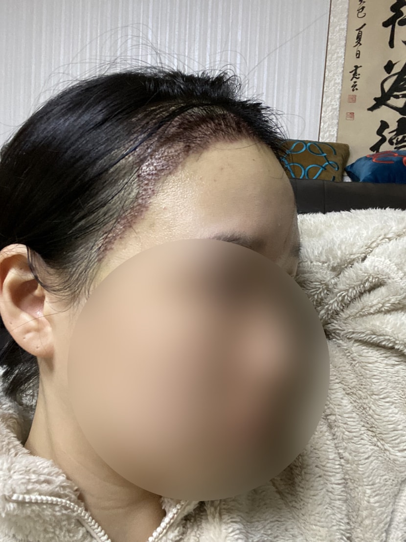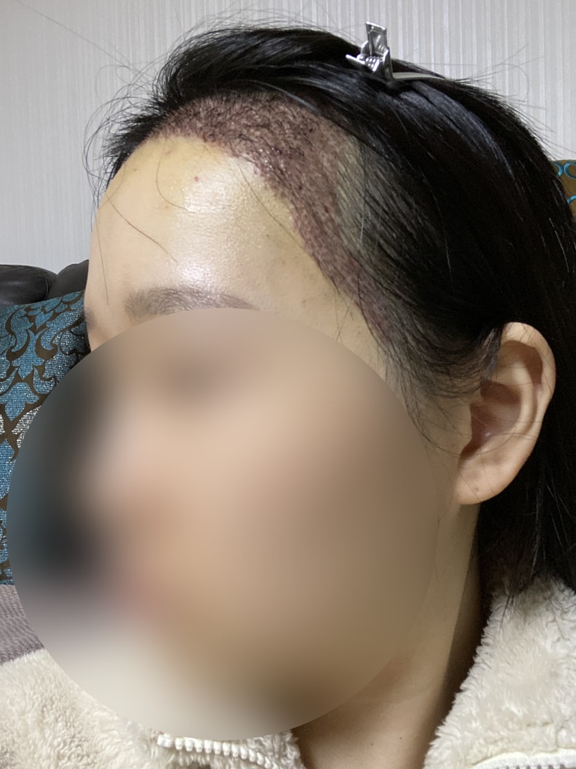 20岁出头,为了矫正M型脱发、降低额头高度,决定植发,第一次到医院就诊时,医生护士都很有信心地讲解,马上手术。 之后第2周摘除了结痂,与其他医院不同,被告知可以开始喝酒和吸烟,从第1个月开始移植头发开始脱落,目前几乎没有头发。