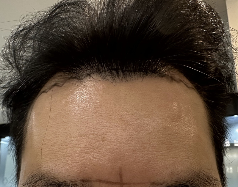 1. 这是医院咨询时院长给定的发际线。用铅笔画的部分是用毛发移植填满的空间。 根据纹理确定移植方向..)