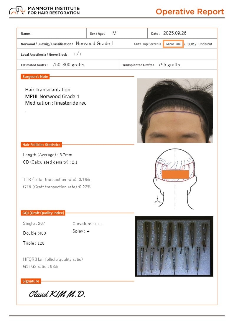 毛(囊)数为795毛囊,费用为907万韩元。 方式为非切开方式,院长均进行了缝隙及移植。