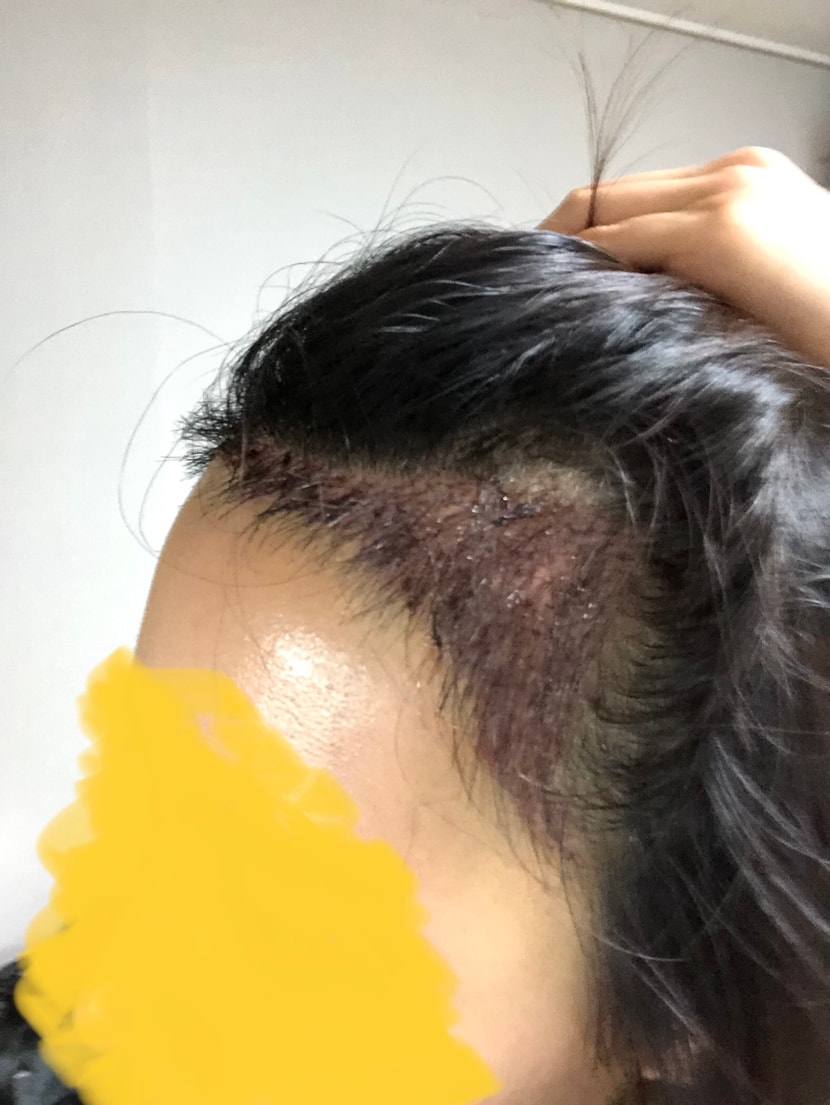 20岁出头,为了矫正M型脱发、降低额头高度,决定植发,第一次到医院就诊时,医生护士都很有信心地讲解,马上手术。 之后第2周摘除了结痂,与其他医院不同,被告知可以开始喝酒和吸烟,从第1个月开始移植头发开始脱落,目前几乎没有头发。