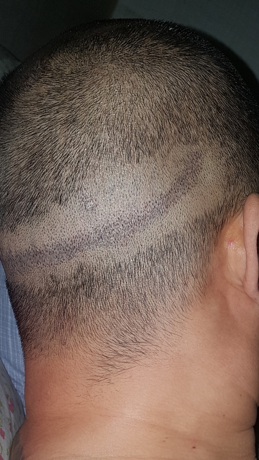 20岁出头,为了矫正M型脱发、降低额头高度,决定植发,第一次到医院就诊时,医生护士都很有信心地讲解,马上手术。 之后第2周摘除了结痂,与其他医院不同,被告知可以开始喝酒和吸烟,从第1个月开始移植头发开始脱落,目前几乎没有头发。