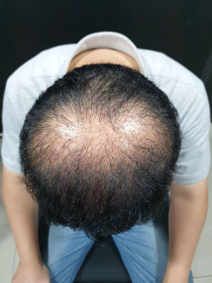 因为我的脱发部位本来就很宽,所以10000角也不能全部填满,所以头顶部分看起来很宽,显得很不足。 "土耳其毛发移植中心说,起初看到我的头发状态后,要想完全填满,必须种植2万株。