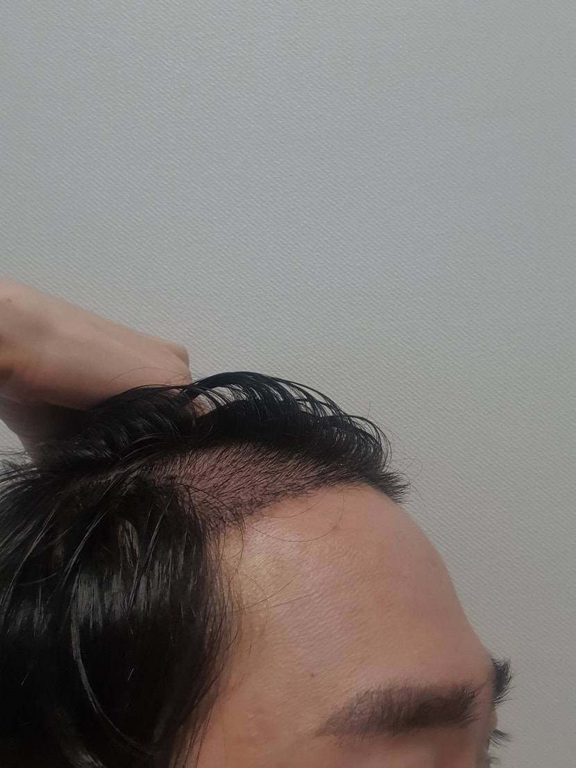 我爸爸那边脱发遗传很强 从高中开始就很早 用对脱发有好处的护发产品 努力管理 虽然试过 但是从23岁开始发际线就逐渐变高了我在机场上班 经常做发型 想在年纪更大之前拥有没有m字的发际线  苦恼了很久,在美发店接受了咨询,接受了手术。就像照片上看到的一样 额头线条上扬的 所以和院长商谈的时候用1400个毛囊进行移植 说看起来最自然 所以决定做移植手术 结束后看了镜子 感觉手术的方向很好 挺好的。女朋友也说变年轻了,比我还喜欢呢。我觉得幸好早点做了。移植后没有疼痛,有点痒? 除此以外 没有 开了6个月的处方抹Minoxidil的药 我会按照院长告诉我的方法认真管理。 虽然只过了两周 但还是能按照种下去 我会好好管理的。