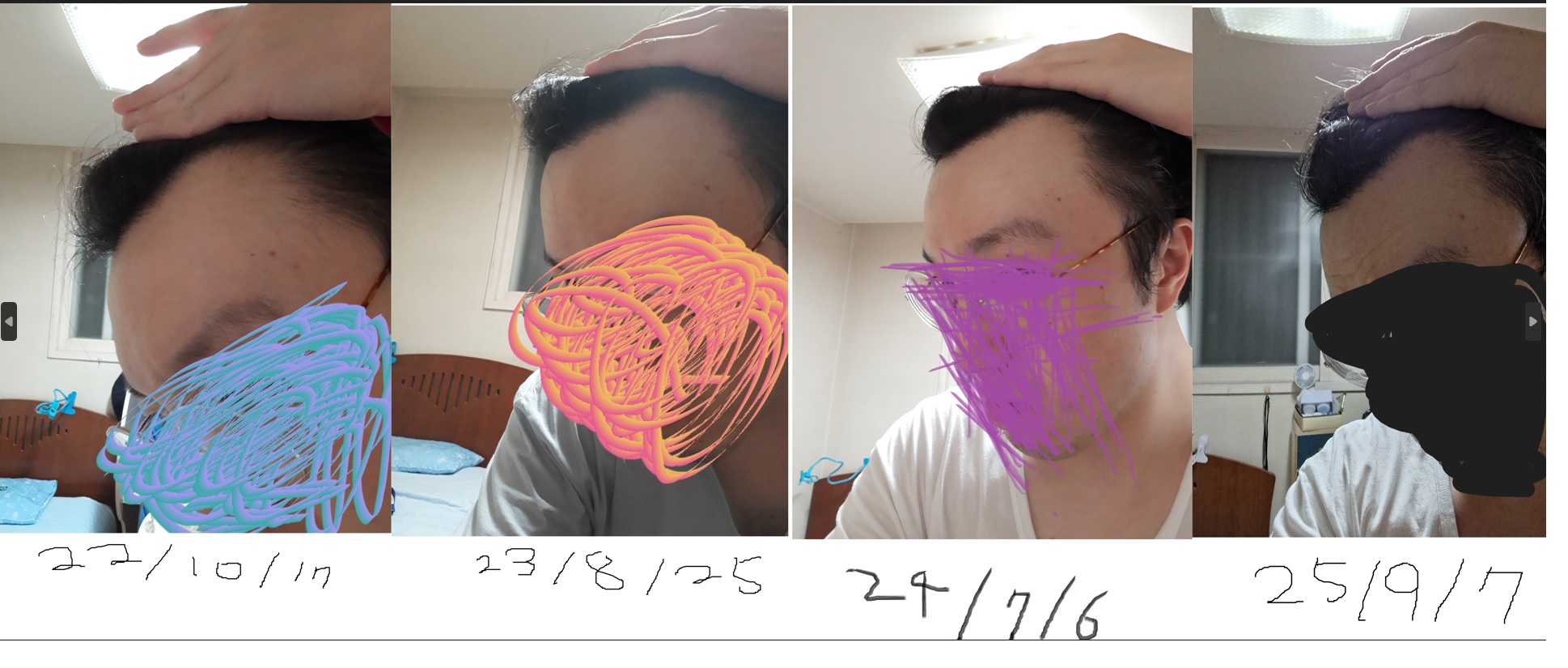 <毛发移植毛发>从20岁出头的大学生时期开始,M字就深深扎根于毛发移植,后来又被多家毛发移植整形医院上门咨询报价。但是到了40岁,终于实现了夙愿(?)事业。提前预约了长假前一天的10月2日,在NEWHAiR 植发中心以非切开完全剃头的方式进行了毛发移植手术。下面是毛发移植之前的照片。 如果迎面吹向额头,就会暴露出他完全是秃头。 < 毛囊结晶>在1,300和1,600个毛囊之间犹豫不决。第一次接受咨询的时候,其实只想做1300毛囊。其实我从幼年时期开始额头就有点M字,所以觉得如果变化太大,会不自然。但也不是容易的手术,为了最大限度地提高满意度,最终选择了1600毛囊。以下设计为手术当天绘制的1600毛囊基准图。 是考虑到现有头发的重叠部位而画的。 < 手术方式 >我也是上班族,但利用长假,选择了完全剃光头的方式。虽然比部分剃头、无剃头便宜,但手术后在家管理起来会更方便。(当然,过完假期回到公司,也害怕职场同事的反应和后果。呜呜)手术室用葫芦瓢果断地剃了头发。 但是也不是完全光头,好像留了2mm左右。之后趴在手术台上,从后脑勺采集毛囊用了2个半小时,午饭吃短后,重新移植到空额头花了3个小时左右。从进入医院到出来,包括咨询、向导、午餐等在内,大约花了7个小时。本来移植的时候听说可以看手机或书,所以野心勃勃地还带了一本书,但是手术室的灯光太耀眼了,不容易。如果习惯了,可以通过手机或手术台前的显示器观看视频,但我只是闭着眼睛静静地呆着。 偶尔也会打瞌睡。手术除了麻醉,没有太大的问题。只是采集部位和移植部位麻醉时非常疼。 不是一般的"刺痛"水平。当然,是可以忍住的程度,但这是持续几分钟的... 采集部位麻醉结束后,移植部位麻醉时特别可怕。ㅠ在移植过程中,毛囊有些不够,就追加采集了,结果可以多移植一点,达到1675毛囊。< 手术1天(翌日)>手术后也没有特别的疼痛,只有喉部采集部位偶尔会有麻麻的感觉。头发这样很难出门,但很少有不适到影响日常生活。手术第1天的第二天,来院学习洗发水的方法,接受了高压氧治疗、激光治疗等后续护理。第1天第一次洗头时,喉部采集部位非常刺痛。ㅠ 但第1天晚上在家洗的时候好多了,第2天更好。第1天的状态如下照片。 < 手术第 3 天 >最后上传今天早上拍的照片。 今天早上起床的时候无意中碰了一下移植部位。 稍微流了一点血。值得庆幸的是,因为是额头发际线最边缘的角落,所以是即使丢失也不会伤心的部位。手术后一段时间内绝对不能碰移植部位。 你说你那么小心,尤其是早上似醒非醒的时候。虽然移植部位、采集部位都还有不少红肿,但似乎正在慢慢变淡。虽然马上就要经历黑暗期了,但是好好克服,明年中秋节的时候,在迎风面前也能堂堂正正地昂首挺胸,不管在哪里都能昂首挺胸吧?术前咨询、手术当天、术后第1~2天护理等所有过程均令人满意。 感谢NEWHAiR 植发中心院长和护士等所有工作人员亲切细致的接待和治疗。
