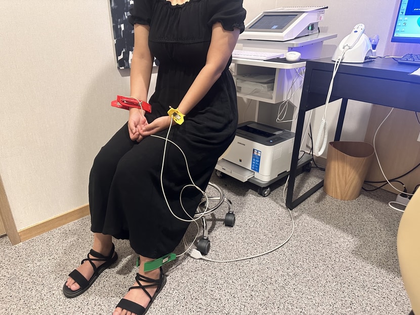 进去后发现给我检查压力。 如果两只手腕和末伏上插着那个夹子一动不动的话,后面的电脑就会显示压力指数!!!! 为什么神经科要运营脱发中心呢,现在想想压力不就是脱发的原因嘛。 所以才会那样!!! 用专门的机器检查压力后检查头皮..