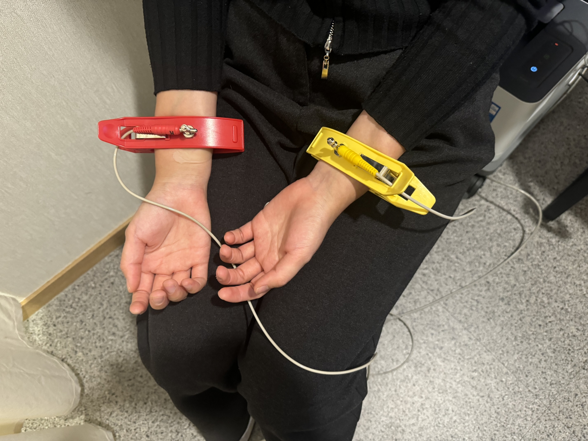 首先叫做压力检查,在手腕和脚腕上夹着夹子,大概3分钟左右一动不动地待着。 说不要动,感觉身体更发抖了。嘿嘿