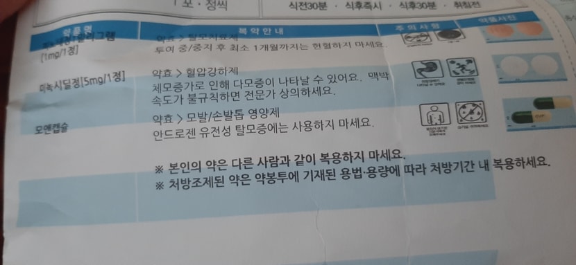 I have 3 pills, but I thought I was taking 1 pill, but how many years are you taking those 3 pills? a milligram of pinotaejeong. 5mg of minoxidil tablets 1 tablet seems to have been divided into 4 pieces of yogon. And 3 tablets of Mo & Capsule dishes for the rest of my life! They give me 36,000 won for a month. 10,000 injections and 40,000 injections for medical treatment are about 10 times a week It stings and hurts when you get hit. It's going to go from the top of your head to the front dozens of times Is the price of the medicine not covered by insurance?