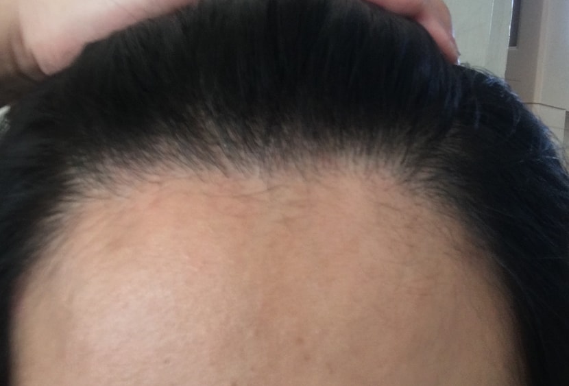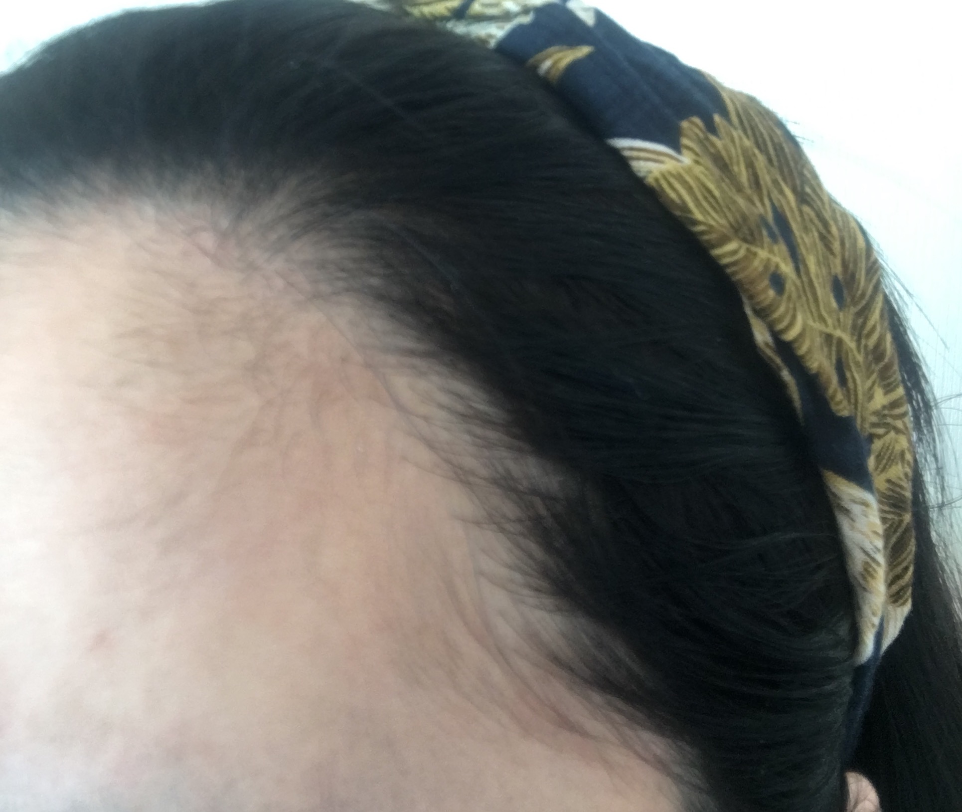 Now, three years later, my bangs are less thick than before surgery and my hairline is crooked, so I'm covering it with La La Chu shading products because it looks like hair loss