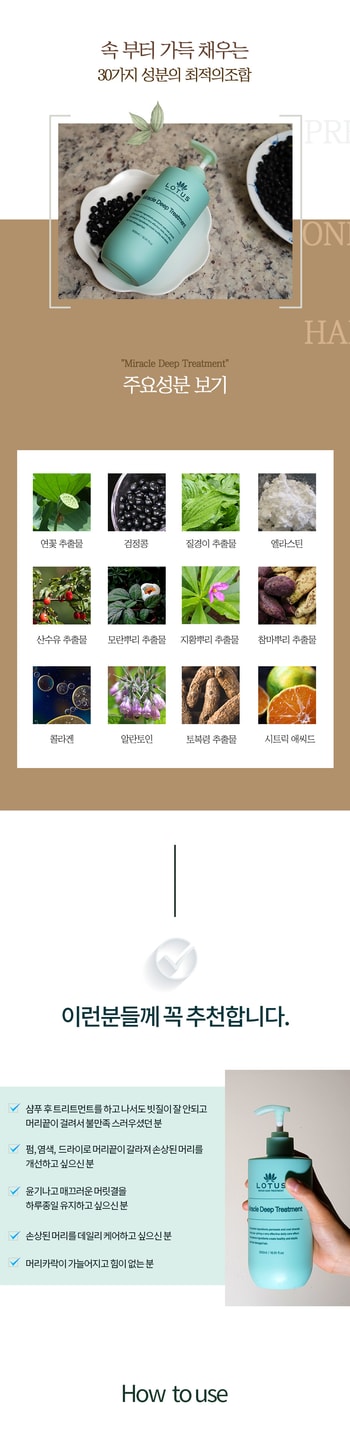 After shampooing, apply an appropriate amount on the palm of your hand and apply it to the entire hair except the scalp, and rinse thoroughly in running water after 1-2 minutes.Ingredients included