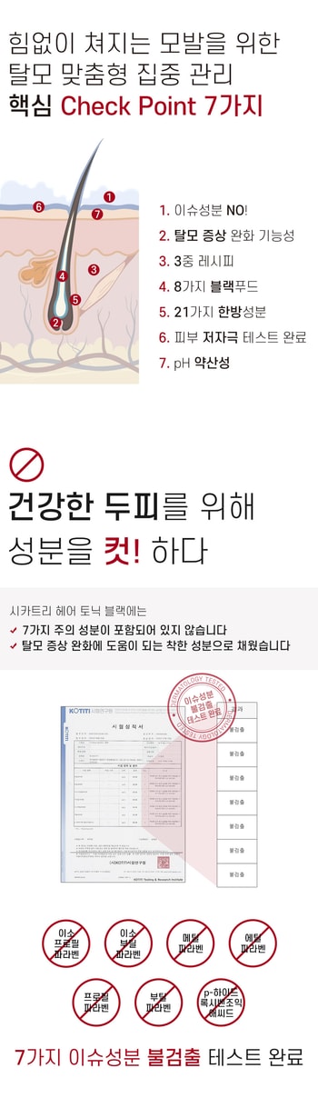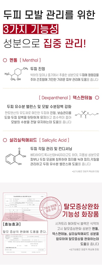 Purified water, ethanol, PG-60 hydrogenated castor oil, menthol, salicylic acid, panthenol, capertripeptide-1, biotin, niacinamide, 1,2-hexanediol, glycerin, black bean extract, black sesame seed extract, pine leaf extract, cypress leaf extract, pomegranate rice fruit extract, western raspberry extract, Mexican seed extract, pine nut blueberry extract, pine nut seed extract, pine nut seed extract, rice extract, thorn bush tree root extract, medicinal wheat,extract of Hanyeoncho, extract of Bottlenoseweed![]() ![]() ![]() ![]() ![]() ![]() ![]() ![]() ![]() 0.0