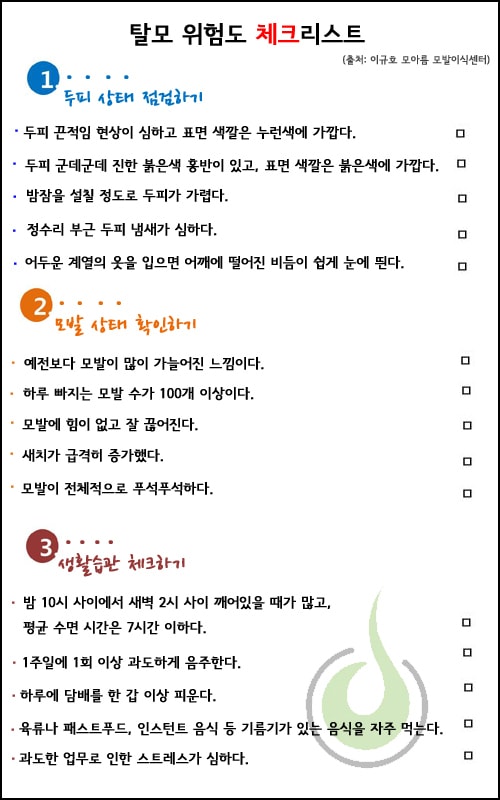 Hair loss is a disease that is very difficult to cure once it begins. As such, prevention and early treatment are very important. Signs of hair loss risk vary widely. More than 100 hairs are constantly lost a day, and the hair may become thinner. In addition, dandruff increases, inflammation increases frequently, and severe itching occurs. However, most people do not pay much attention to these signs of hair loss, often causing or worsening hair loss. The way to check the signs of hair loss is to check the health status and lifestyle of the scalp and hair.