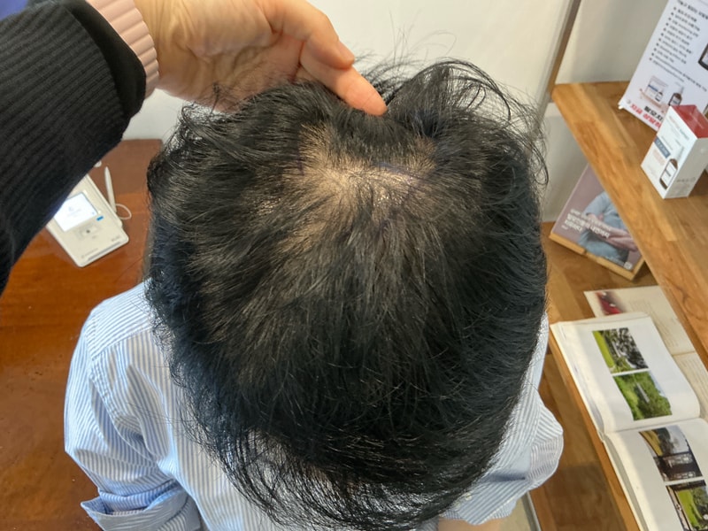 There's hair loss on the top of the head and diffuse hair loss that's less dense