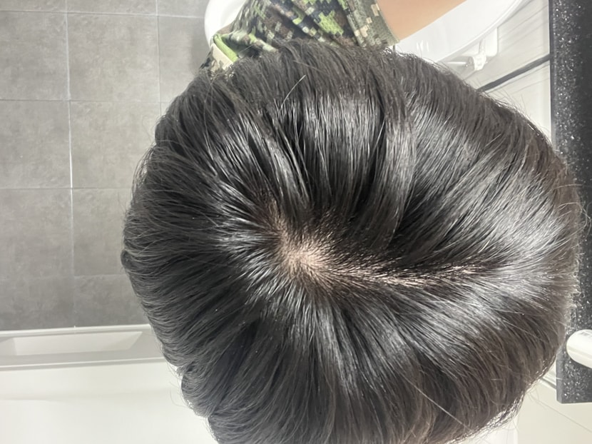 My hair grew a lot in a month. Last month, I didn't have a lot of hair to pull over from my forehead, but now I have quite a bit of hair to pull over. Overall, even if you look down from above, your hair on both sides is growing a lot. Although the top of the head is still weak, it seems that the length and quantity have increased enough to be combed in 30 days. It's very encouraging.