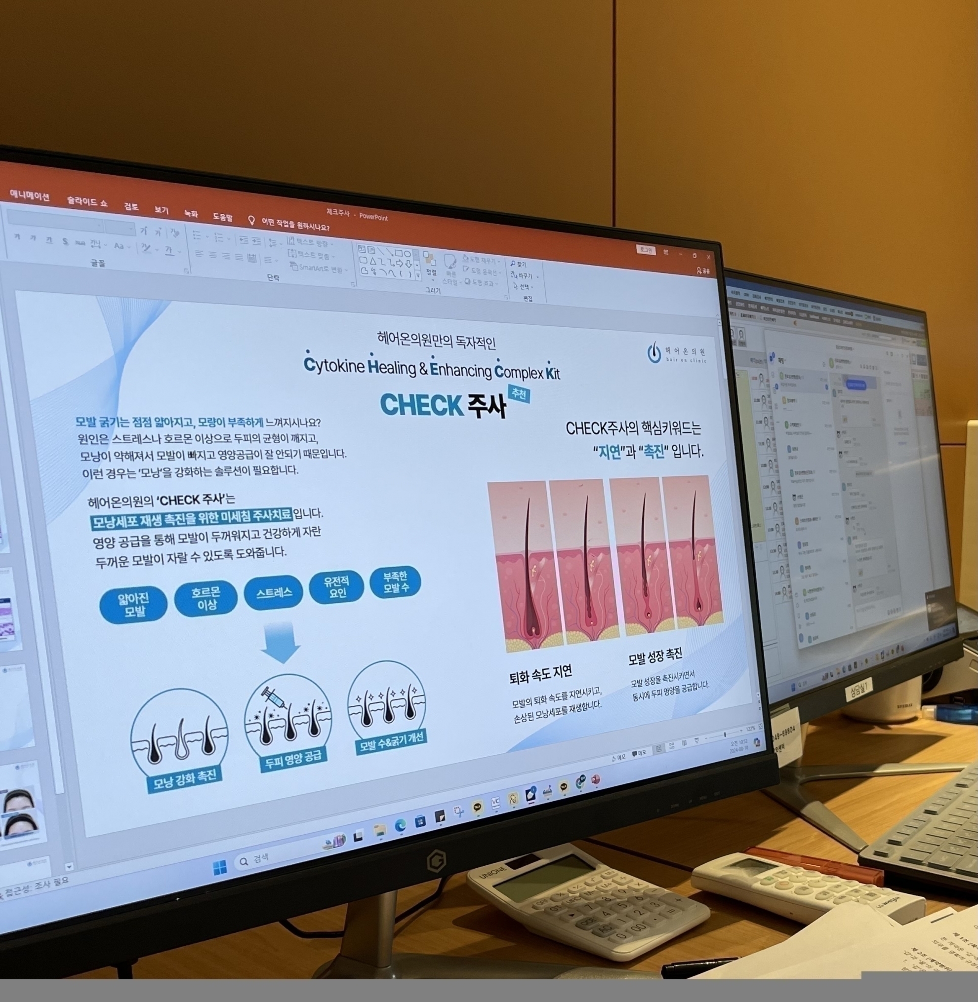 <제가 선택한 패키지는 체크 베이직 패키지로 구성을 간단하게 정리히자면 두피 스케일링 + 스티머 + 산소제트필 + check 주사 + 적외선 + 스마트룩스 + 약처방 요런 과정입니다 ,, !! 1) 두피 스케일링 스케일링 약을 먼저 꼼꼼하게 도포해주시는데 너무 시원했어요 ! 화할 수 있다고 불편하면 말씀해달라 하셨는데 하나도 안 불편하고 너모 시원했다는 .. 2) 스티머 스티머로 두피 각질을 불려주는 과정입니다 ! 3) 산소 제트필 이제 불린 묵은 각질들을 수압으로 촤라락 ~ 하고 제거해주는데 이 과정도 너모 시원했어요 ... 사람들이 두피 스케일링 왜 하는지 알 것 같은 느낌 .. 4) 대망의 check 주사 ,, 모낭 강화주사 사실 뭐 얼마나 아프겠어 하고 별 생각 없었는데 생각보다는 쬐끔 ? 아프더라구요 ! ㅋㅋ 뭔가 두피 문신하는 그런 기분 ? 꼼꼼하게 미세침으로 두피에 작은 상처를 내고 이제 이 병원만의 배합 레시피 약을 주입하는 그런 과정이에용 따꼼 따꼼했지만 두피에 영양을 공부하고 모낭세포를 재생시켜준다니 견딜만했답니다 5) 적외선 이제 모낭 강화주사 맞은거 잘 흡수되도록 적외선 쬐주고 6) 스마트 룩스 이거 분명 설명 들었는데 뭐였지 해서 검색해보니 두피 피지 조절과 재생 효과가 있다구 합니당 >