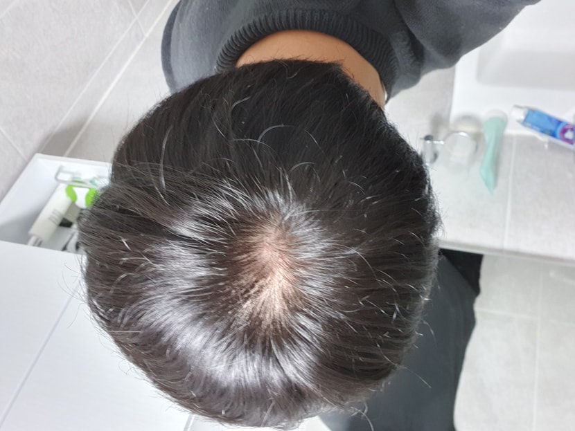 脱毛がもっとひどかった右側は少しまばらな部分があります。左側はもう目立たないほどよく定着したようです。薬を地道に飲むのが重要だというので、ちゃんと飲もうと努力中です。大金を使ったのに結果が満足してよかったです!