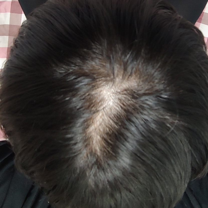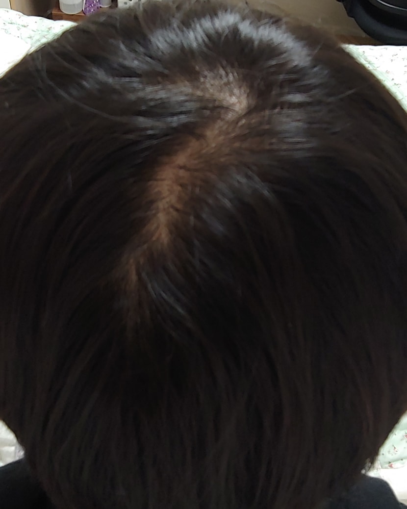 脱毛がもっとひどかった右側は少しまばらな部分があります。左側はもう目立たないほどよく定着したようです。薬を地道に飲むのが重要だというので、ちゃんと飲もうと努力中です。大金を使ったのに結果が満足してよかったです!
