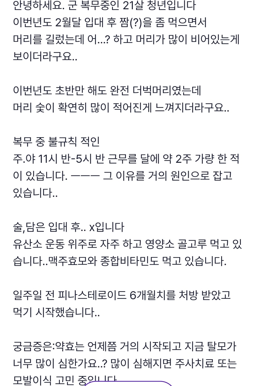 こんにちは。24年10月に手術を受け、10ヶ月時点での進行状況を体験談に上げます。まず、私は軍隊に行ってきてから、M字 薄毛の進行が深まり、薬物治療でも進展がなく、手術を受けることになりました。本人は切開方式で3600毛の手術をしました。 価格は400万ウォン半ばでした。(https://daedamo.com/photo2/597107 : 3ヶ月時点での進行体験談リンクです!)Before : After : Before/Afterの違いははっきりしていますよね? 本当に大満足です!!! 手術3ヶ月目までは迷いましたが、6ヶ月前後でしっかりと感じました! 本当に髪が伸びてきます!手術後の管理を厳しくしなければならないのか? そんなこともありません。 AGA治療薬よく食べるとよく育つんですね。(もちろん私が喫煙/飲酒をしないのも影響があるんじゃないかと思います)私がこの文を書く理由も明確です。 ストレスを受けずに、そのまま植えてください!m字薄毛特性上、髪を下ろすとよく見えなかったんですが、正直、髪をとかすの隠すのが大変でしたね(笑)(前の職場が現場エンジニアだったので、現場に行ってくるとびしょ濡れになった 頭の間から シュンシュン 空いている額を隠すのに苦労した記憶が ㅠㅠ))ちょっとオーバーで、精神的ストレスの治療費と思って手術してもいいくらい自信の差があります! 植毛お悩みの方なら、一刻も早く手術を受けて幸せになることを願っています~PS診療も親切にしてくださり、良い結果を出してくださった毛多兀病院、ヤン·ユグン先生、誠にありがとうございます!