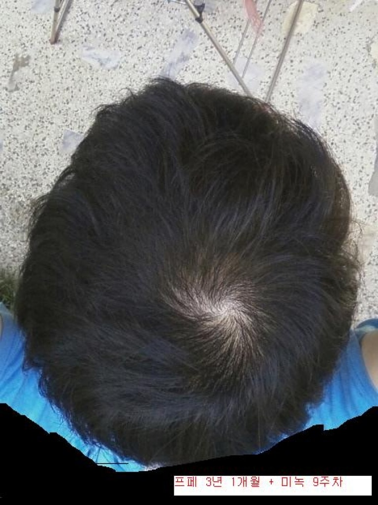 6. 9週目ですが、頭頂部の髪を洗う時、以前は手に取る感じもほとんどなく、確かに脱毛患者の髪なんだなと感じましたが、今は脱毛部位の髪の毛が確実に太くなったのが感じられます。 鏡で見ても、以前のように頭皮が丸見えだったのは、だいぶ良くなった気がします。 臨床で見ると、12週目から本格的に効果が見え、24週目に最大効果を、その後は維持程度が普通だというので、まだもっと良くなることができると肯定的に考えています。 24週目に写真を一度アップしてみます。