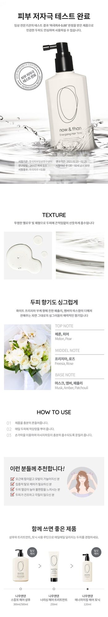 製品を十分に振った後、毎日頭皮に適量を塗った後、指を利用してマッサージするように十分に吸収されるようにこすります。包含成分