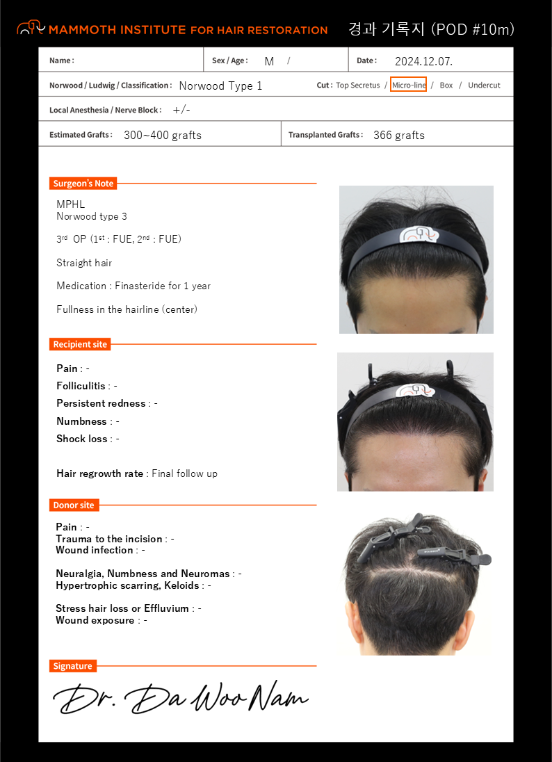 他のクリニックで1次手術を受けた後、だいぶ良くなりましたが、密度やラインの非対称が少し残念で、マンモスヘアラインクリニックで少量矯正しました。 マンモスヘアラインクリニックはあまりにも高いことで有名なので、最初の手術だったら思いもよらなかったでしょうが、今回は少量なので330万ウォンで可能だったので、そのまましました。 金額は少なかったのですが、手術前後の応対から最後の経過まで、一般の大量手術を受けた方々と同じサービスを受け、それでさらにゲットした感じですね。 ライン矯正の結果も満足ですし、髪も自信を持って流せるようになりました。 ナム·ダウ院長、ありがとうございます。