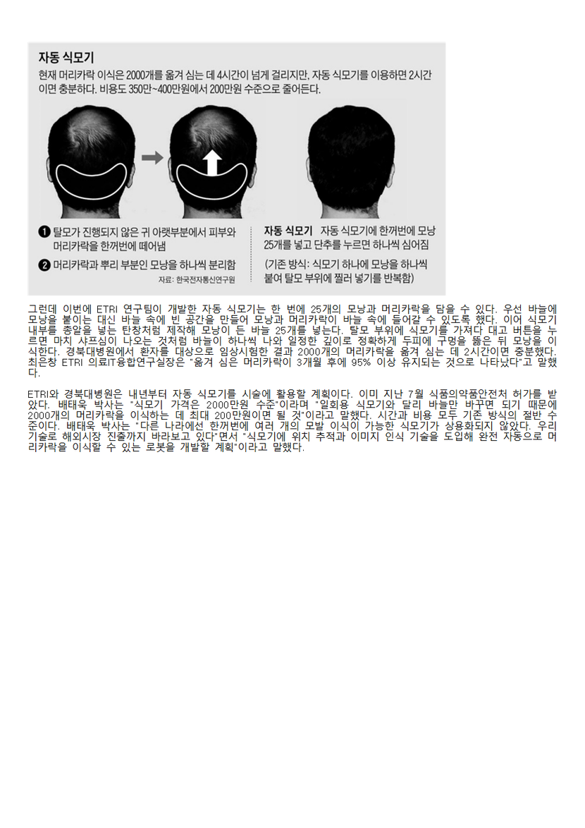 [ETRI·경북대, 자동 植毛機 개발]비용 200만원으로 절반 줄여 3개월 후에도 95% 이상 유지임상시험 끝내 내년 실제 시술
