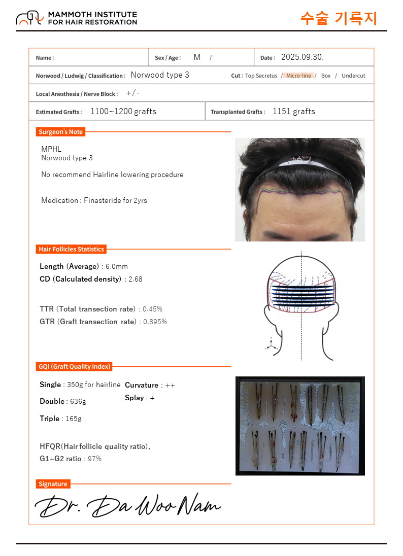 狎鴎亭マンモスヘアラインクリニックヘアラインの医院のナム·ダウ院長から植毛いただきました。