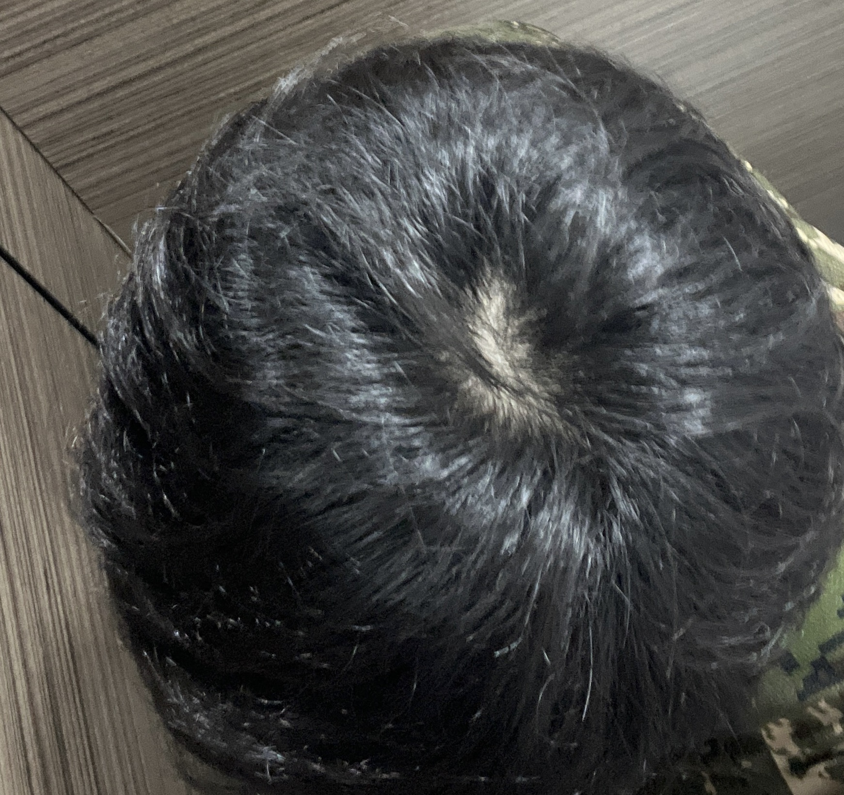 脱毛がもっとひどかった右側は少しまばらな部分があります。左側はもう目立たないほどよく定着したようです。薬を地道に飲むのが重要だというので、ちゃんと飲もうと努力中です。大金を使ったのに結果が満足してよかったです!