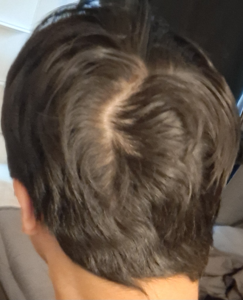 脱毛がもっとひどかった右側は少しまばらな部分があります。左側はもう目立たないほどよく定着したようです。薬を地道に飲むのが重要だというので、ちゃんと飲もうと努力中です。大金を使ったのに結果が満足してよかったです!