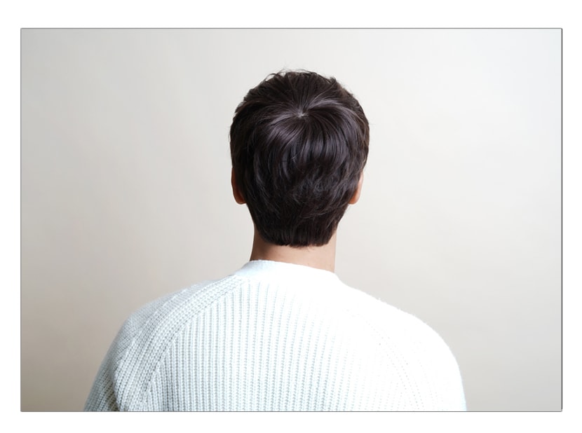 2. 着用者は30代半ばで、左の髪の毛が相対的に不足している状況