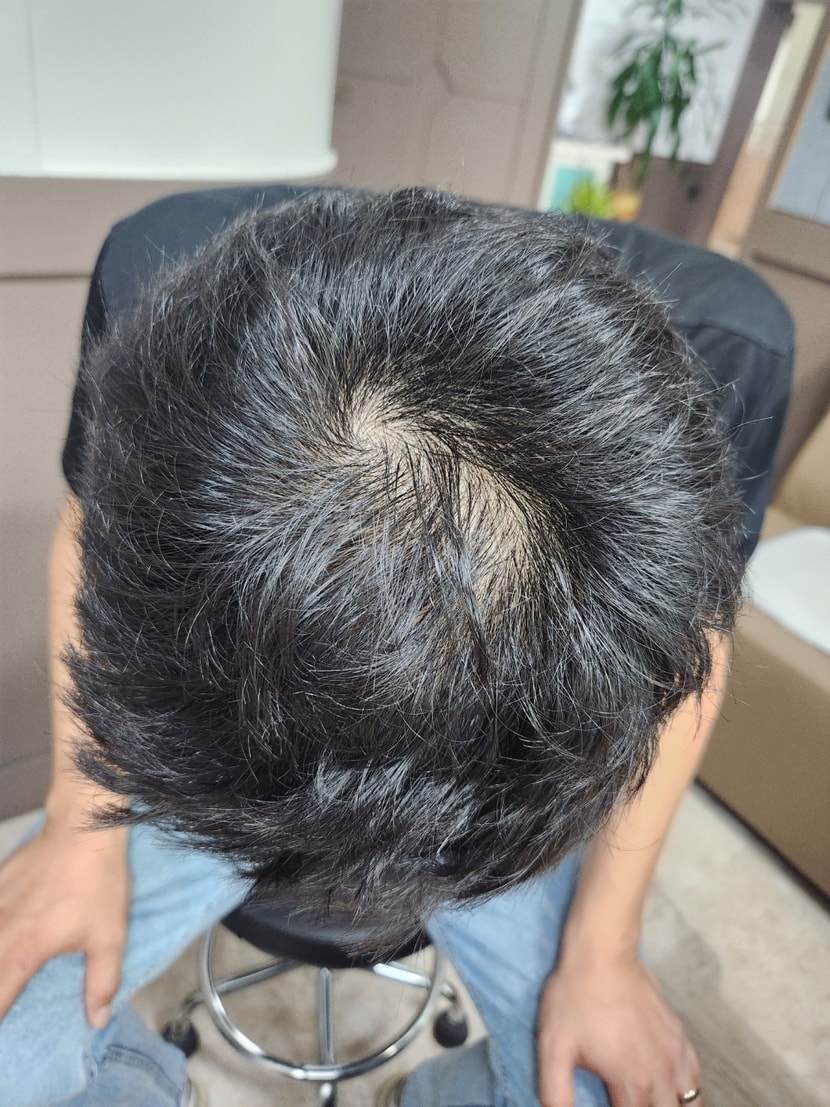정수리탈모 모발이식후 6개월이 지났습니다 아직 완성 단계는 아니지만, 과정이 좋아서 올려요. 중간 점검 단계지만, 앞으로 더 굵어지고 탄탄해질 풍성한 머리카 락을 기대하고 있습니다.