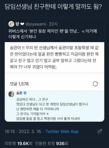 팬이긴한데 담임샘 친구면ㅋㅋㅋㅋㅋ 음ㅋㅋㅋㅋ 애매하긴 한데ㅋㅋㅋㅋㅋㅋㅋ