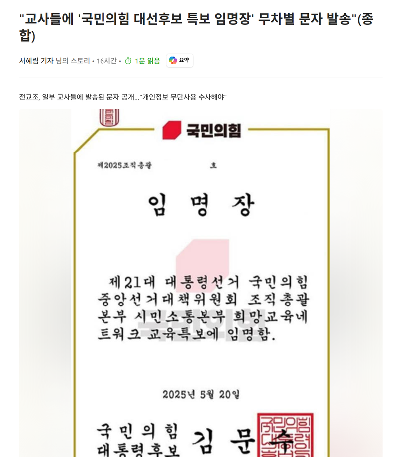 전체[일반잡담] "교사들에 '국민의힘 대선후보 특보 임명장' 무차별 문자 발송"