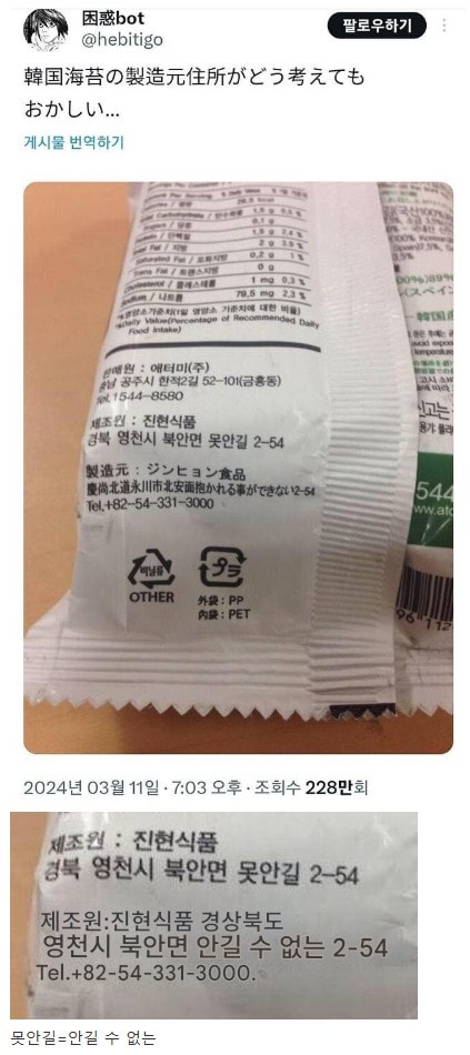 [유머&이슈] 한국의 김 제조사 주소가 이상하다는 일본인