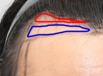 질문2. B 병원에서는 아래선만 표시해서, 위에 어디서부터 심어져 내려오는지 궁금한데요. 모발이식하면 당연히 빨간데부터 심어져 내려오는게 당연한건가요? 아님, 혹시 B는 파란데만 계획하고 있는 건 아닌지 병원에 확인해봐야 할까요.