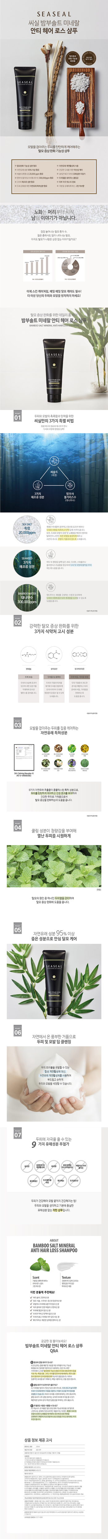인산죽염(씨솔드), 대나무 수(밤부사 불가리수), 정제수, 해조류(다시마, 조류, 스피룰리나플라텐시스 추출물), 올리브 오일, 토코페롤, 하이드롤라이즈드 콜라겐, 하이드롤라이즈드 케라틴, 카프릴릴글라이콜, 다이소듐스페이트, 시트릭애써드, 다이소듐이디티에이, 1.2-헥산다이올, 소듐벤조에이트, 에틸헥실글리세린, 향료, 다이쇼듐 라우레스 설포석시네이트, 라우릴하이드록시설테인, 코카마이드메틸엠이에이, 라우릴글루코사이드, 글리세린, 피이지-120메틸글루코스디올리에이트, 폴리쿼티늄-10, 코카미도프로릴베타인, 세트리모늄 클로라이드, 판테놀, 폴리쿼티늄-7, , 트라이하이드록시스테아린, C12-13 알킬락레이트, 피이지-6 카프릴릭/카프릭글리세라이즈, 카프릴릭/카프릭트라이글리세라이드, 소듐플리나프탈렌설포네이트, 부틸렌글라이콜, 프로판다이올, 스타아렌/아크릴레이트플리머, 멘톨, 소나무추출물, 뽕나무껍질추출물, 녹차추출물, 감국꽃추출물, 붉나무충영추출물, 황금추출뭉, 인동덩쿨추출물, 퉁퉁마디추출물, 징크피리치온, 살리실릭애씨드, 징크클로라이드, . 에탄올소듐클로라이드, 시트릭애씨드, 1.2-헥산다이올, 다이소듐이디티에이, 향료![]() 0.0